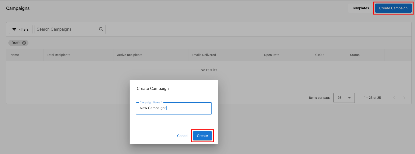 Step 1 - Navigate to Campaigns > Overview > Create Campaign. Give your campaign a name, and select 'Create.'