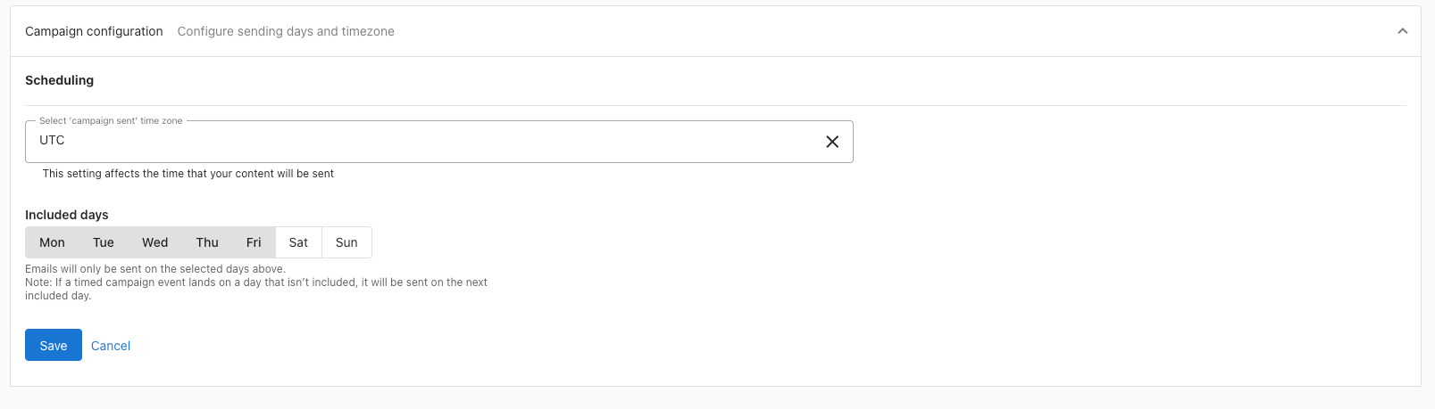 Step 2 - Configure your campaign as desired. Choose a time zone, and which days emails will be sent on.